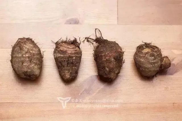 多子芋,形状大头朝上(大魁芋形状为纺锤形),可以看到小芋头分檗的方式 | 余天一