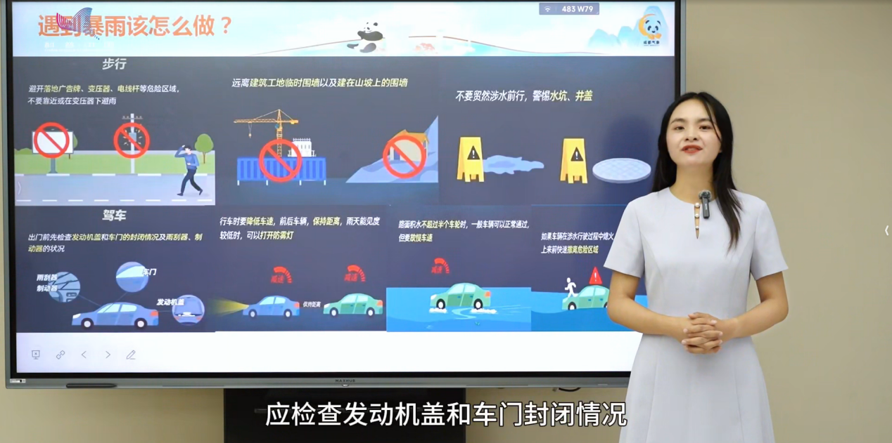 那遇到暴雨要怎么办呢?步行的朋友要注意避开广告牌电线杆,远离临时围墙,警惕水坑井盖,不要贸然涉水前行;而驾车的朋友出门前应检查发动机盖和车门封闭情况,行车时降低车速,与前车保持距离。